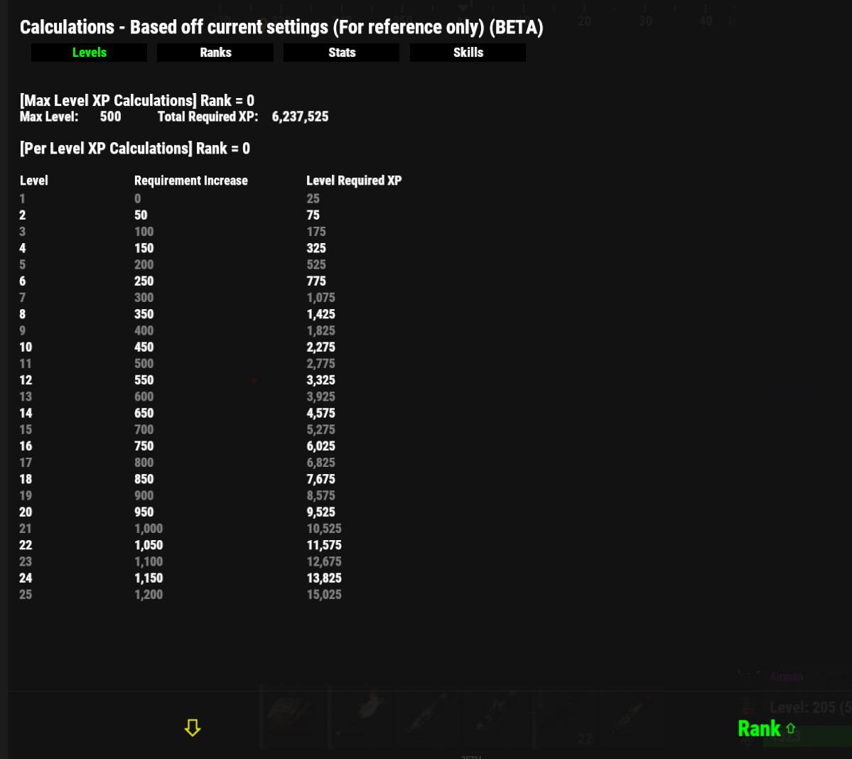 - 1 - Levels: The levels page shows the total required XP for each level, total XP to reach max level, and total XP per level per rank if Ranks are enabled and you have Increase level XP requirement enabled within rank settings. If ranks and increase level XP requirement are both enabled you will see buttons on the bottom right of the Levels page that allows you to switch between each rank and show the level results per rank. If Increase level XP requirement in ranks is not enabled then the XP requirement per level will be the same for every rank and so there will be no rank selection option at the bottom of the page.