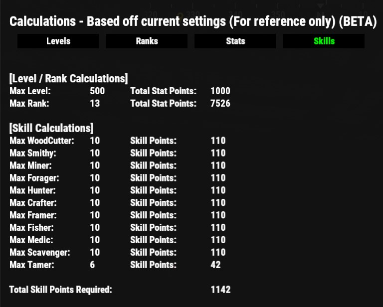 - 3 - Stats: The stats page shows the total number of stat points a player will receive at max level, max rank, how many points are required to reach max level of each stat, and how many points are required to reach max level of all stats combined. This page can help you determine how many stat points to award players for each level and rank to achieve the results you want whether you would like them to earn enough to reach max level of all stats or only a select few.