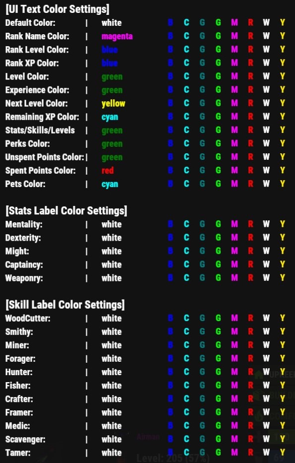 "UI Text Colors": { "defaultcolor": "white", "level": "green", "ranklevel": "blue", "rankxp": "blue", "rankname": "magenta", "experience": "green", "nextlevel": "yellow", "remainingxp": "cyan", "statskilllevels": "green", "perks": "green", "unspentpoints": "green", "spentpoints": "red", "pets": "cyan", "mentality": "white", "dexterity": "white", "might": "white", "captaincy": "white", "weaponry": "white", "woodcutter": "white", "smithy": "white", "miner": "white", "forager": "white", "hunter": "white", "fisher": "white", "crafter": "white", "framer": "white", "medic": "white", "scavenger": "white", "tamer": "white", "xpbar": "green", "armorbar": "red" },