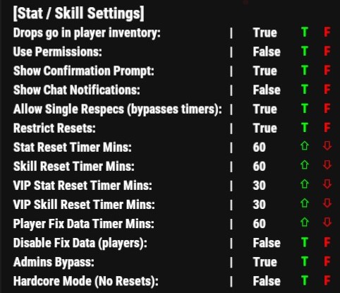 - Allow Single Respecs (bypasses timers): This option will allow players to reset each stat or skill individually without having to reset all stats or skills at once. This option will bypass any reset timer restrictions applied but will count towards Daily Limits if daily limits are enabled. See Daily Limits page for more information on limits.