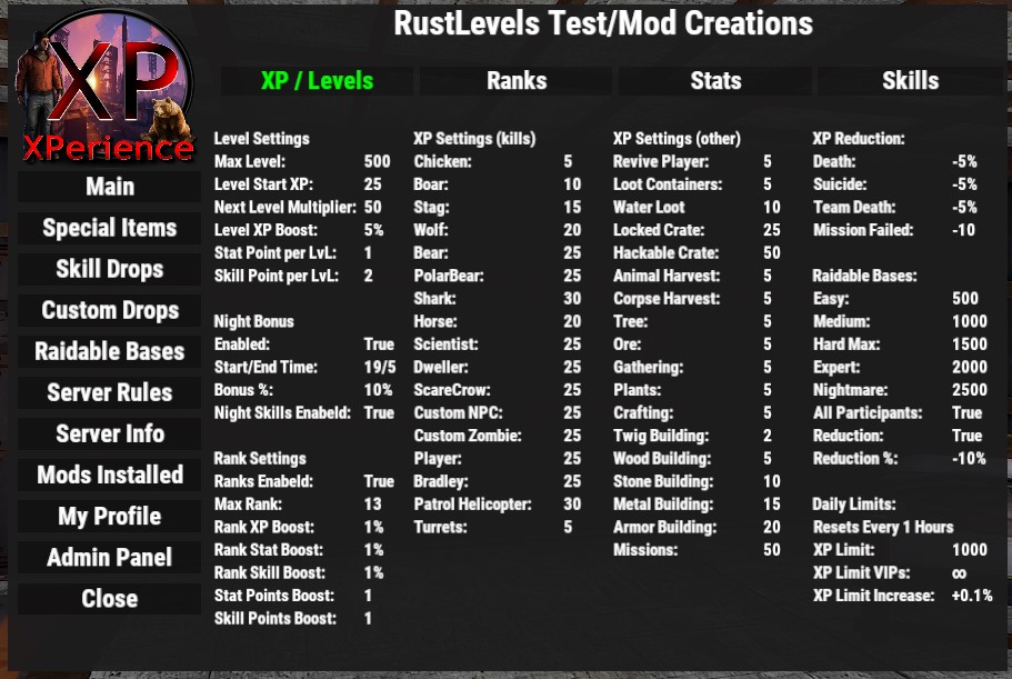 - Show Settings Button: This will show the Server Info button on the welcome panel menu that displays all the current XP, Levels, Ranks, Stats, and Skill settings for the server.