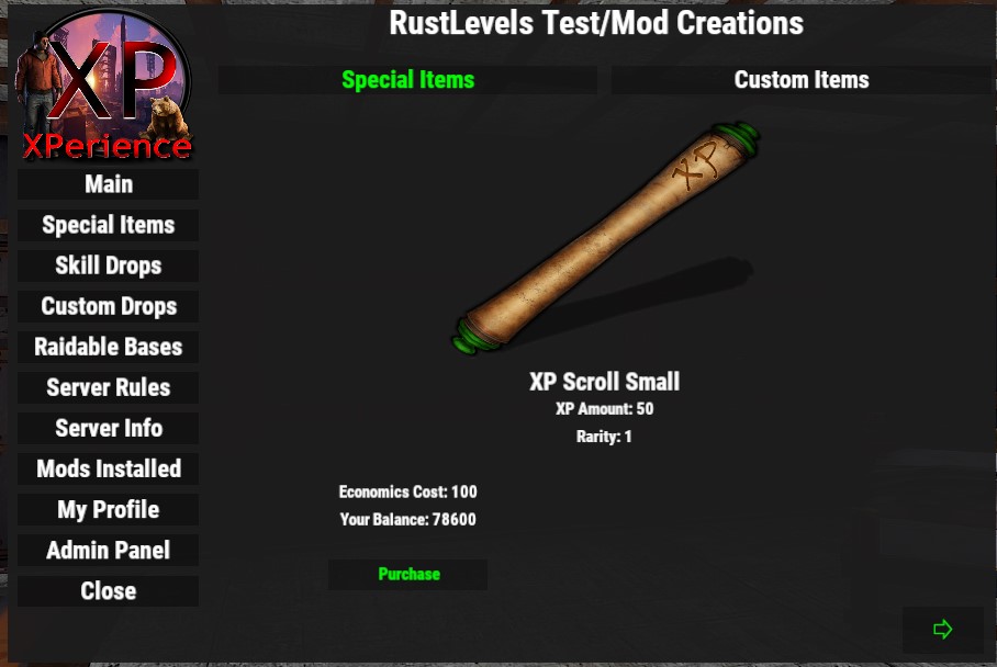 - Show Special Items Button: This will show the Special Items button on the welcome menu where all special items, default and custom, will show. If economics or server rewards are used for special item purchases then players can buy these items directly from the special items page on the welcome menu. See Special Items page for more details about special items.
